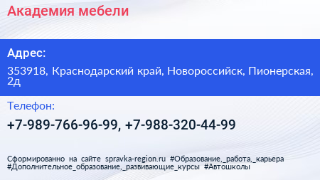 Академия мебели по адресу 353918, Краснодарский край, Новороссийск, Пионерская, 2д в дальнейшем Организация, размещена в следующих категориях: