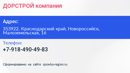 ДОРСТРОЙ, компания по адресу 353922, Краснодарский край, Новороссийск, Малоземельская, 16 в дальнейшем Организация, размещена в следующих категориях: