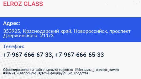 ELROZ GLASS по адресу 353925, Краснодарский край, Новороссийск, проспект Дзержинского, 211/3 в дальнейшем Организация, размещена в следующих категориях: