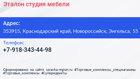 Эталон, студия мебели по адресу 353915, Краснодарский край, Новороссийск, Энгельса, 55 в дальнейшем Организация, размещена в следующих категориях: