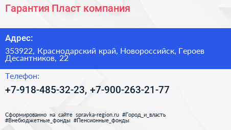 Гарантия Пласт, компания по адресу 353922, Краснодарский край, Новороссийск, Героев Десантников, 22 в дальнейшем Организация, размещена в следующих категориях: