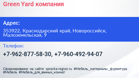Green Yard, компания по адресу 353922, Краснодарский край, Новороссийск, Малоземельская, 9 в дальнейшем Организация, размещена в следующих категориях:
