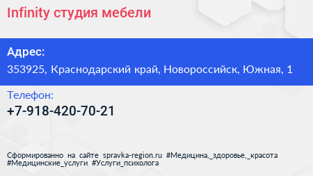 Infinity, студия мебели по адресу 353925, Краснодарский край, Новороссийск, Южная, 1 в дальнейшем Организация, размещена в следующих категориях: