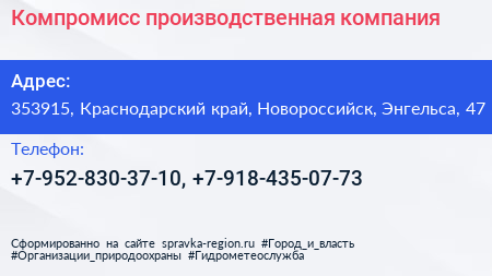 Компромисс, производственная компания по адресу 353915, Краснодарский край, Новороссийск, Энгельса, 47 в дальнейшем Организация, размещена в следующих категориях: