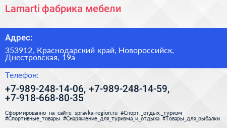 Lamarti, фабрика мебели по адресу 353912, Краснодарский край, Новороссийск, Днестровская, 19а в дальнейшем Организация, размещена в следующих категориях: