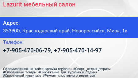 Lazurit, мебельный салон по адресу 353900, Краснодарский край, Новороссийск, Мира, 1в в дальнейшем Организация, размещена в следующих категориях: