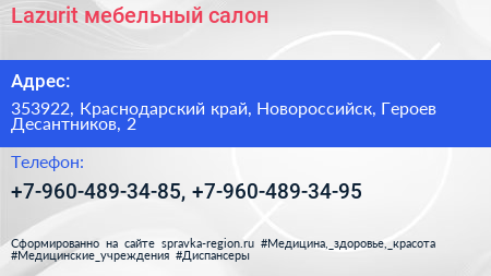 Lazurit, мебельный салон по адресу 353922, Краснодарский край, Новороссийск, Героев Десантников, 2 в дальнейшем Организация, размещена в следующих категориях: