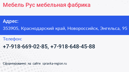 Мебель Рус, мебельная фабрика по адресу 353905, Краснодарский край, Новороссийск, Энгельса, 95 в дальнейшем Организация, размещена в следующих категориях:
