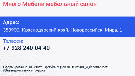 Много Мебели, мебельный салон по адресу 353900, Краснодарский край, Новороссийск, Мира, 1 в дальнейшем Организация, размещена в следующих категориях: