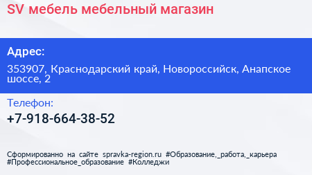 SV-мебель, мебельный магазин по адресу 353907, Краснодарский край, Новороссийск, Анапское шоссе, 2 в дальнейшем Организация, размещена в следующих категориях: