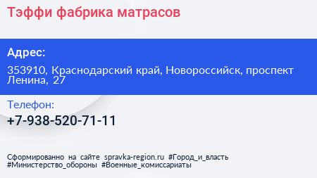 Тэффи, фабрика матрасов по адресу 353910, Краснодарский край, Новороссийск, проспект Ленина, 27 в дальнейшем Организация, размещена в следующих категориях: