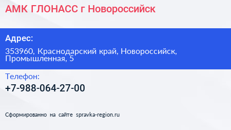 АМК ГЛОНАСС, г. Новороссийск по адресу 353960, Краснодарский край, Новороссийск, Промышленная, 5 в дальнейшем Организация, размещена в следующих категориях:
