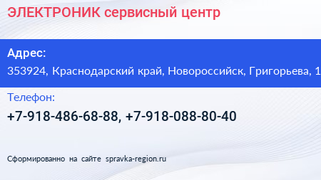 ЭЛЕКТРОНИК, сервисный центр по адресу 353924, Краснодарский край, Новороссийск, Григорьева, 1 в дальнейшем Организация, размещена в следующих категориях: