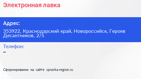 Электронная лавка по адресу 353922, Краснодарский край, Новороссийск, Героев Десантников, 2/5 в дальнейшем Организация, размещена в следующих категориях: