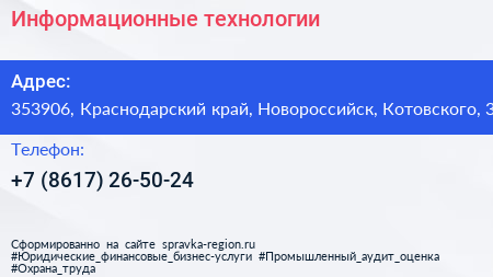 Информационные технологии по адресу 353906, Краснодарский край, Новороссийск, Котовского, 3 в дальнейшем Организация, размещена в следующих категориях: