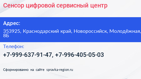 Сенсор, цифровой сервисный центр по адресу 353925, Краснодарский край, Новороссийск, Молодёжная, 8Б в дальнейшем Организация, размещена в следующих категориях: