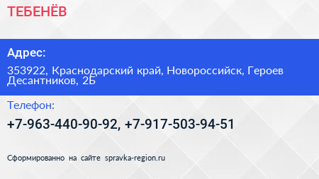 ТЕБЕНЁВ по адресу 353922, Краснодарский край, Новороссийск, Героев Десантников, 2Б в дальнейшем Организация, размещена в следующих категориях: