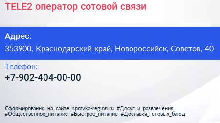 TELE2, оператор сотовой связи по адресу 353900, Краснодарский край, Новороссийск, Советов, 40 в дальнейшем Организация, размещена в следующих категориях: