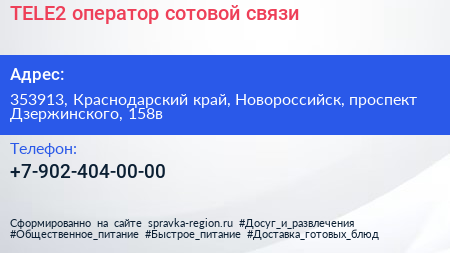 TELE2, оператор сотовой связи по адресу 353913, Краснодарский край, Новороссийск, проспект Дзержинского, 158в в дальнейшем Организация, размещена в следующих категориях:
