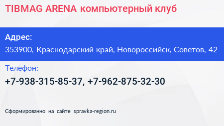 TIBMAG ARENA, компьютерный клуб по адресу 353900, Краснодарский край, Новороссийск, Советов, 42 в дальнейшем Организация, размещена в следующих категориях: