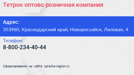 Тетрон, оптово-розничная компания по адресу 353960, Краснодарский край, Новороссийск, Лиловая, 4 в дальнейшем Организация, размещена в следующих категориях: