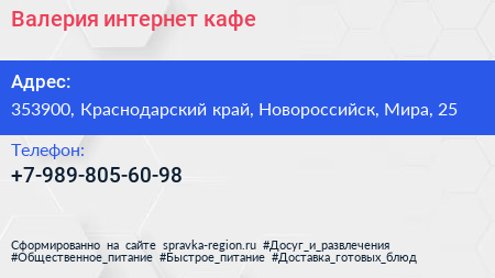 Валерия, интернет-кафе по адресу 353900, Краснодарский край, Новороссийск, Мира, 25 в дальнейшем Организация, размещена в следующих категориях: