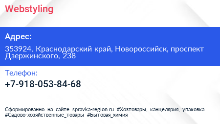 Webstyling по адресу 353924, Краснодарский край, Новороссийск, проспект Дзержинского, 238 в дальнейшем Организация, размещена в следующих категориях: