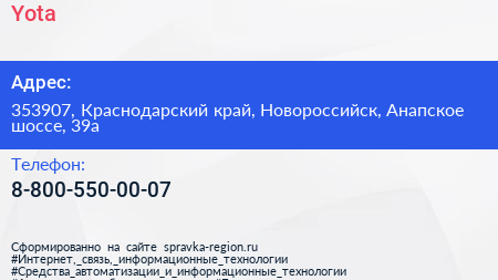 Yota по адресу 353907, Краснодарский край, Новороссийск, Анапское шоссе, 39а в дальнейшем Организация, размещена в следующих категориях: