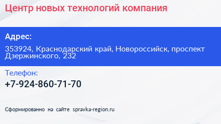 Центр новых технологий, компания по адресу 353924, Краснодарский край, Новороссийск, проспект Дзержинского, 232 в дальнейшем Организация, размещена в следующих категориях: