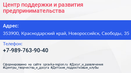 Центр поддержки и развития предпринимательства по адресу 353900, Краснодарский край, Новороссийск, Свободы, 35 в дальнейшем Организация, размещена в следующих категориях: