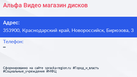 Альфа Видео, магазин дисков по адресу 353900, Краснодарский край, Новороссийск, Бирюзова, 3 в дальнейшем Организация, размещена в следующих категориях: