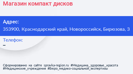 Магазин компакт-дисков по адресу 353900, Краснодарский край, Новороссийск, Бирюзова, 3 в дальнейшем Организация, размещена в следующих категориях: