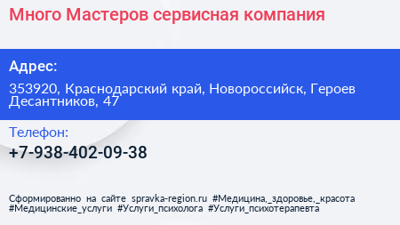Много-Мастеров, сервисная компания по адресу 353920, Краснодарский край, Новороссийск, Героев Десантников, 47 в дальнейшем Организация, размещена в следующих категориях: