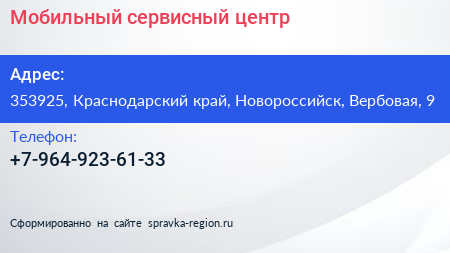 Мобильный сервисный центр по адресу 353925, Краснодарский край, Новороссийск, Вербовая, 9 в дальнейшем Организация, размещена в следующих категориях: