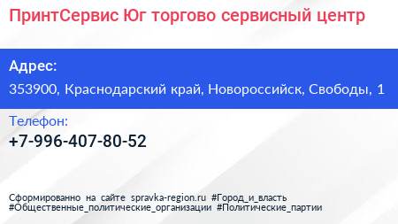 ПринтСервис-Юг, торгово-сервисный центр по адресу 353900, Краснодарский край, Новороссийск, Свободы, 1 в дальнейшем Организация, размещена в следующих категориях: