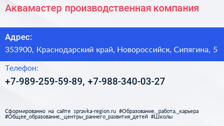 Аквамастер, производственная компания по адресу 353900, Краснодарский край, Новороссийск, Сипягина, 5 в дальнейшем Организация, размещена в следующих категориях: