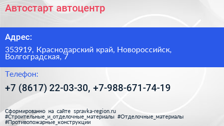 Автостарт, автоцентр по адресу 353919, Краснодарский край, Новороссийск, Волгоградская, 7 в дальнейшем Организация, размещена в следующих категориях: