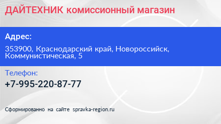 ДАЙТЕХНИК, комиссионный магазин по адресу 353900, Краснодарский край, Новороссийск, Коммунистическая, 5 в дальнейшем Организация, размещена в следующих категориях: