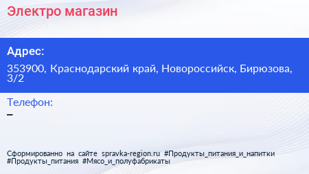 Электро, магазин по адресу 353900, Краснодарский край, Новороссийск, Бирюзова, 3/2 в дальнейшем Организация, размещена в следующих категориях: