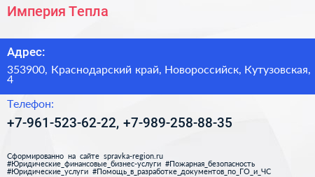 Империя Тепла по адресу 353900, Краснодарский край, Новороссийск, Кутузовская, 4 в дальнейшем Организация, размещена в следующих категориях: