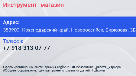 Инструмент+, магазин по адресу 353900, Краснодарский край, Новороссийск, Бирюзова, 3Б в дальнейшем Организация, размещена в следующих категориях: