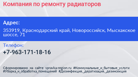 Компания по ремонту радиаторов по адресу 353919, Краснодарский край, Новороссийск, Мысхакское шоссе, 71 в дальнейшем Организация, размещена в следующих категориях: