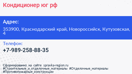 Кондиционер-юг.рф по адресу 353900, Краснодарский край, Новороссийск, Кутузовская, 4 в дальнейшем Организация, размещена в следующих категориях: