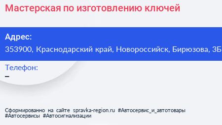 Мастерская по изготовлению ключей по адресу 353900, Краснодарский край, Новороссийск, Бирюзова, 3Б в дальнейшем Организация, размещена в следующих категориях: