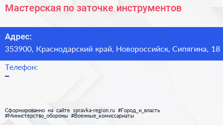 Мастерская по заточке инструментов по адресу 353900, Краснодарский край, Новороссийск, Сипягина, 18 в дальнейшем Организация, размещена в следующих категориях: