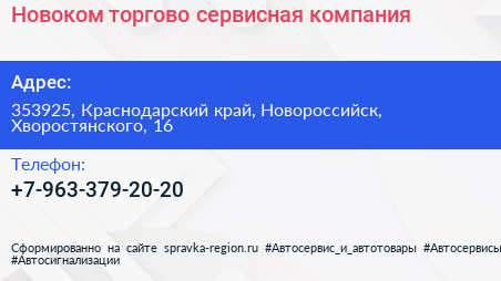 Новоком, торгово-сервисная компания по адресу 353925, Краснодарский край, Новороссийск, Хворостянского, 16 в дальнейшем Организация, размещена в следующих категориях: