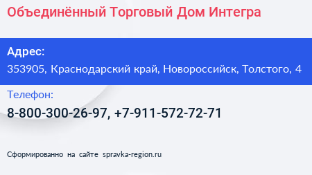 Объединённый Торговый Дом Интегра по адресу 353905, Краснодарский край, Новороссийск, Толстого, 4 в дальнейшем Организация, размещена в следующих категориях: