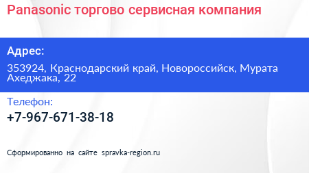 Panasonic, торгово-сервисная компания по адресу 353924, Краснодарский край, Новороссийск, Мурата Ахеджака, 22 в дальнейшем Организация, размещена в следующих категориях: