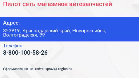 Пилот, сеть магазинов автозапчастей по адресу 353919, Краснодарский край, Новороссийск, Волгоградская, 99 в дальнейшем Организация, размещена в следующих категориях: