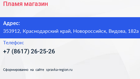 Пламя, магазин по адресу 353912, Краснодарский край, Новороссийск, Видова, 182а в дальнейшем Организация, размещена в следующих категориях: